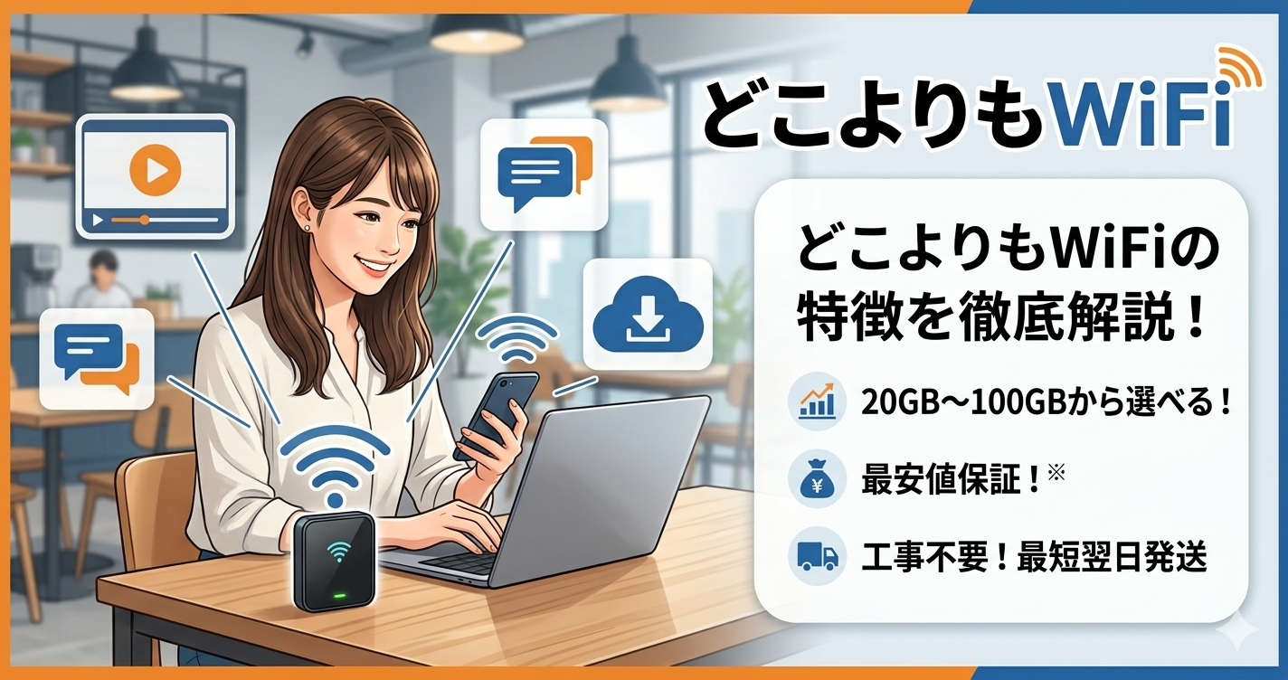 「どこよりもWiFi」は、とにかく安さにこだわりたい方、自分に合ったデータ容量を選びたい方に最適なモバイルWiFiです。他社との料金比較を提示すればさらに値下げ交渉ができる「最安値保証」や、20GBから100GBまでの選べる3プランなど、独自の強みが満載です。工事不要で最短翌日からすぐに高速インターネットを使い始められるのも大きな魅力です。この記事では、複雑になりがちな料金プランや見落としがちな注意点まで、わかりやすく解説します。